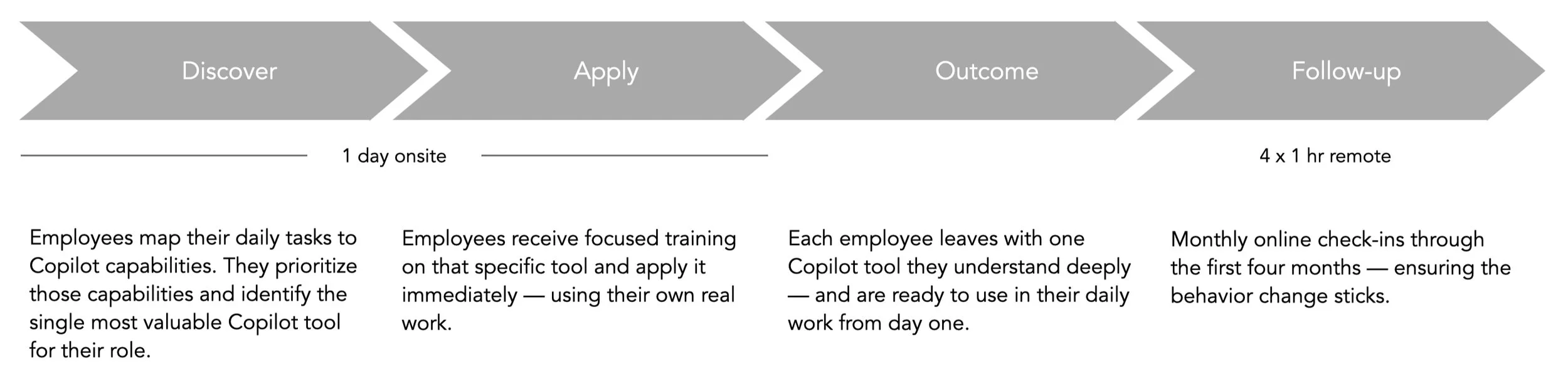 After the initial rollout, your internal teams are trained to deliver the methodology themselves — no ongoing dependency on external facilitators. Annual Refresher Training keeps them current as Copilot evolves.