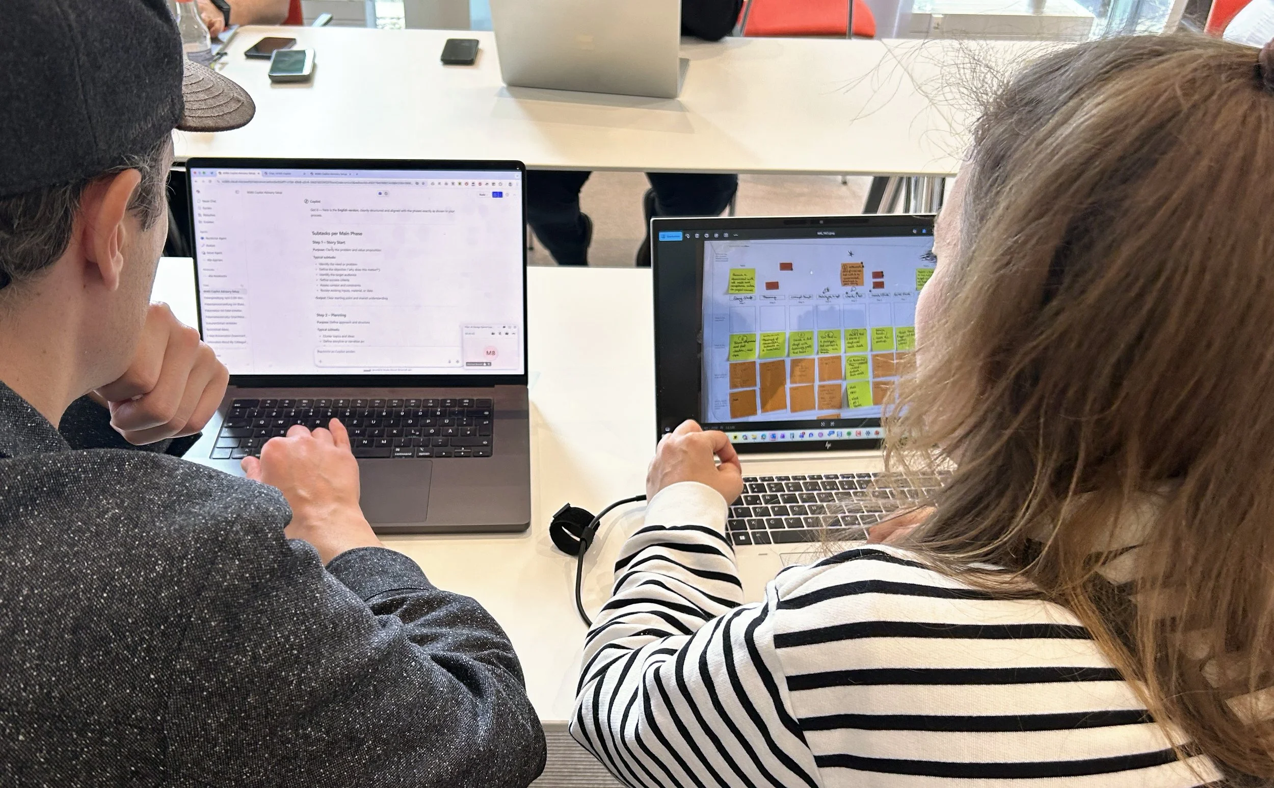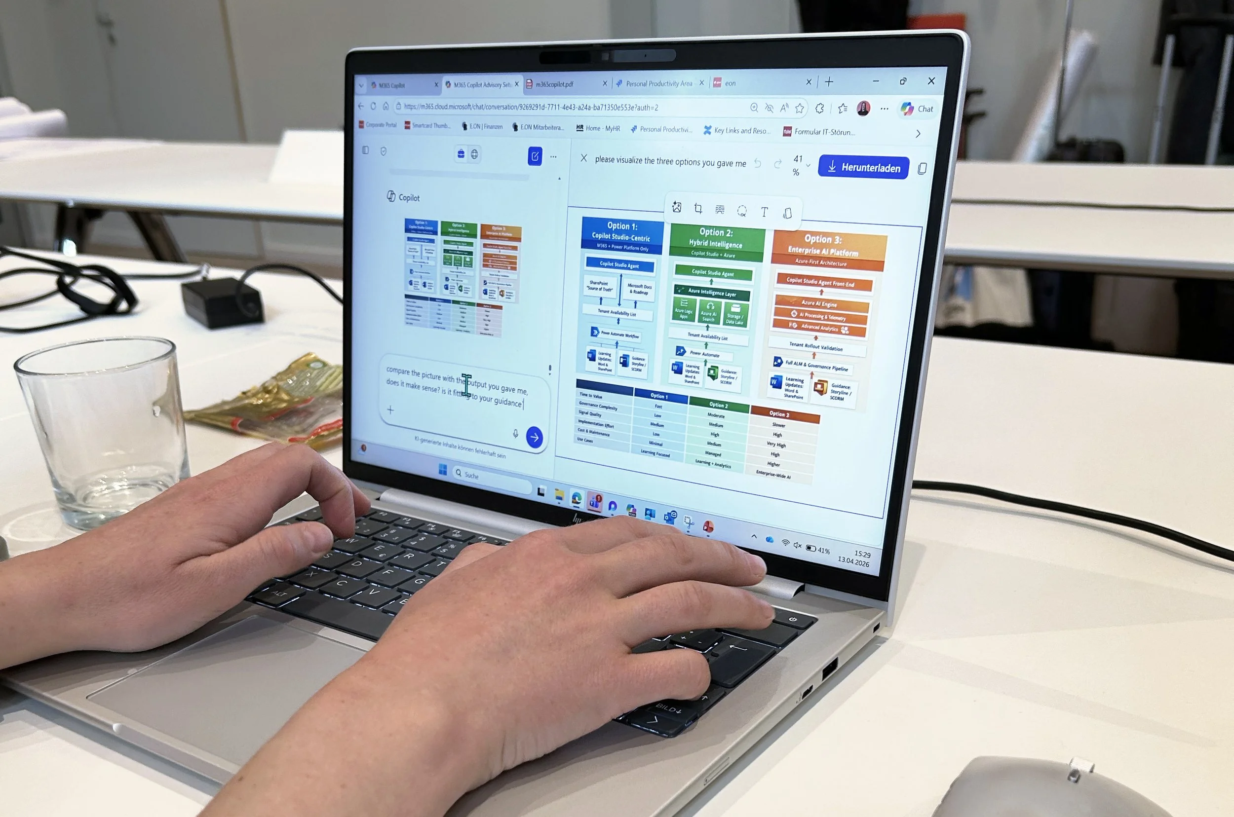 Participants work in small teams of 2–3 people — typically from the same department — on workflows they share in their daily work. All teams run in parallel, guided throughout the day by two trainers. Rather than sitting through generic exercises, every team applies the methodology to something real and relevant to their role. By the end of the day, every participant has identified the Copilot tool most valuable to them — and knows exactly how to use it.