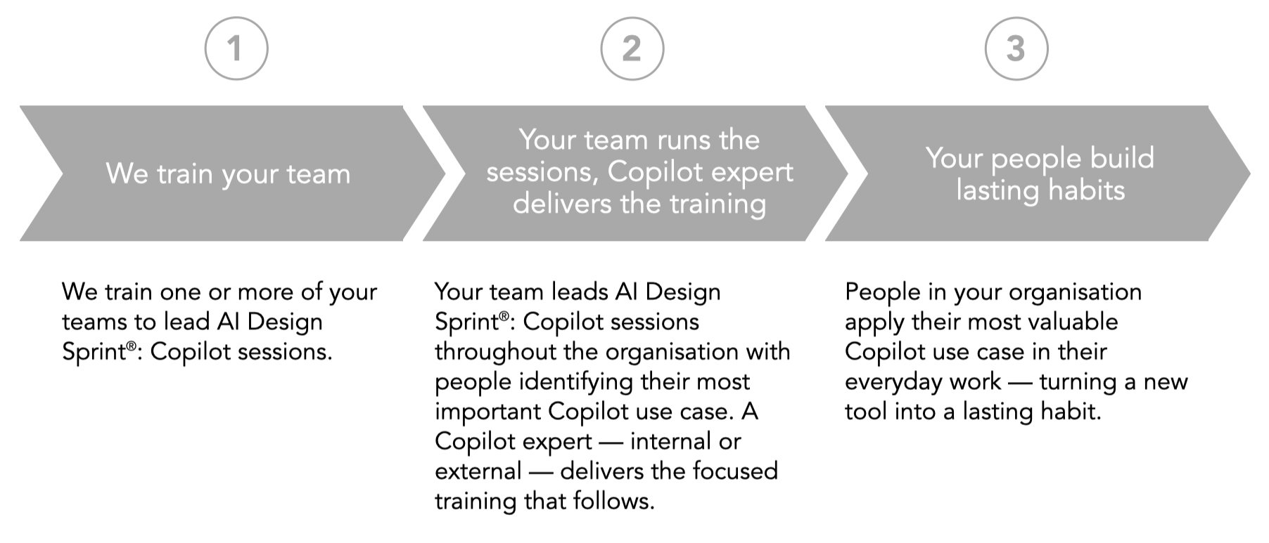 We train one or more of your internal teams to lead AI Design Sprint®: Copilot sessions — so you can reach every employee with their most valuable Copilot use case.